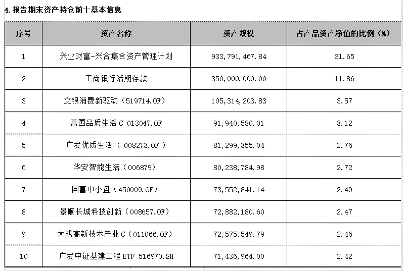 从前十大持仓来看,该产品第一大持仓“兴业财富-兴合集合资产管理计划”投资金额为9.33亿元,占产品资产净值的31.65%;第二大持仓工商银行活期存款,资产规模为3.5亿元,占比11.86%;其余均为公募基金,且以股票型、混合型基金为主。