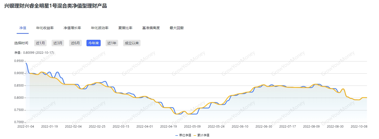 自A股于2022年4月下旬开始反弹,该产品净值亦同步回升。据南财理财通数据,在今年4月22日,该产品累计净值下探至0.7338,触及历史新低。截至10月25日,其累计净值已回升至0.7879,近半年净值涨幅达7.37%。