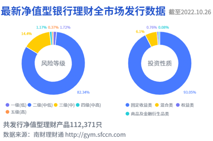 南财金融终端、南财理财通数据显示,截至2022年10月26日,全市场共发行净值型理财产品112,371只。其中,一级(低风险)产品占比1.72%,二级(中低风险)产品占比82.34%,三级(中风险)产品占比14.40%,四级(中高风险)产品占比1.17%,五级(高风险)产品占比0.37%。