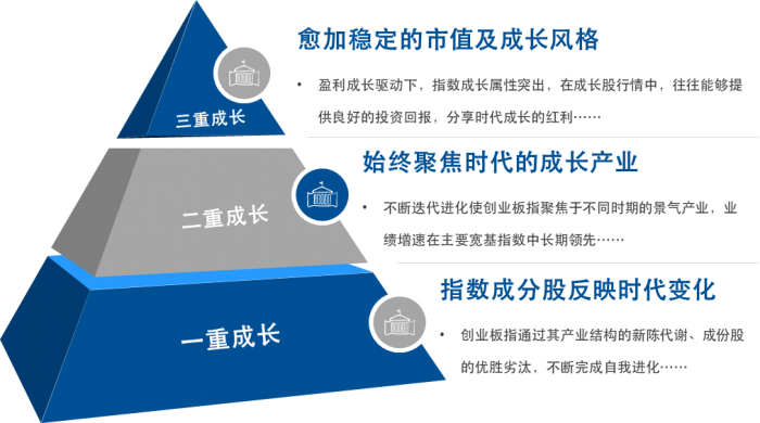 纵览创业板指的发展历程,总结来看指数的三重成长属性,保证了指数一直紧跟时代变革,奠定了其较好的中长期投资价值。