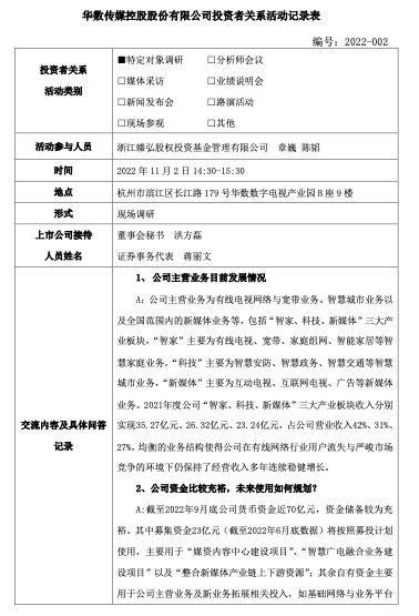 华数传媒向投资者介绍了公司主营业务目前发展情况,公司主营业务为有线电视网络与宽带业务、智慧城市业务以及全国范围内的新媒体业务等,包括“智家、科技、新媒体”三大产业板块,“智家”主要为有线电视、宽带、家庭组网、智能家居等智慧家庭业务,“科技”主要为智慧安防、智慧政务、智慧交通等智慧城市业务,“新媒体”主要为互动电视、互联网电视、广告等新媒体业务。2021年度公司“智家、科技、新媒体”三大产业板块收入分别实现35.27亿元、26.32亿元、23.24亿元,占公司营业收入42%、31%、 27%,均衡的业务结构使得公司在有线网络行业用户流失与严峻市场竞争的环境下仍保持了经营收入多年连续稳健增长。