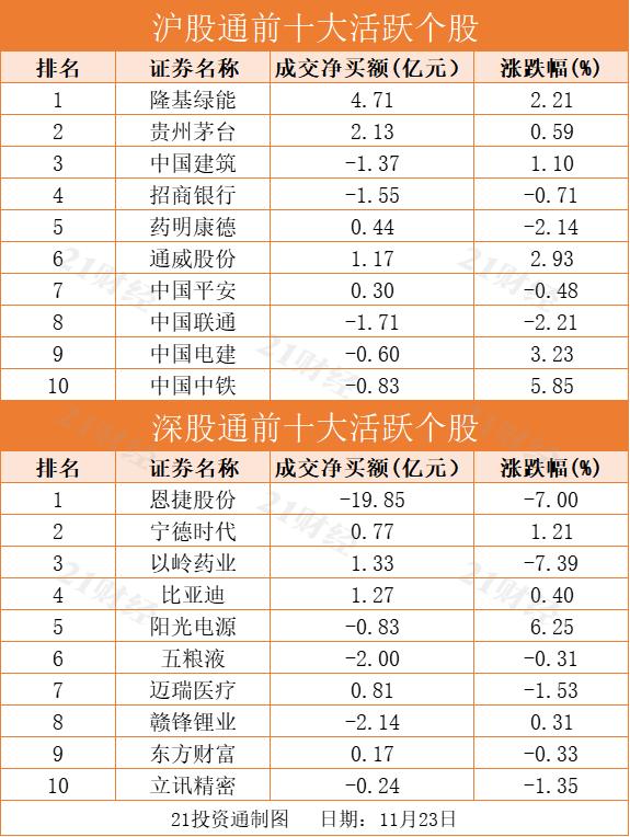十大活跃个股方面,隆基绿能(601012.SH)、贵州茅台(600519.SH)、以岭药业(002603.SZ)净买入额居前,金额分别为4.71亿元、2.13亿元、1.33亿元。