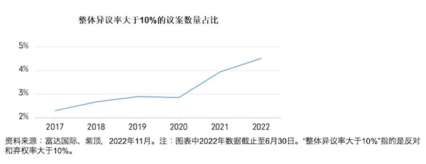 24日,富达国际发布的2022年《中国公司投后管理报告》显示,A股投资者在股东投票参与率方面表现出平稳提升。在2020至2022年中期,获得10%以上“反对”和“弃权”票的议案数量(包括来自中小股东和控股股东)激增70%,达1831项。在无实际控制人的公司所提出的所有决议中,遭到强烈反对的比例也大幅增长,从2020年到2022年中期,增幅超过了5个百分点。不过,中小股东的参与程度还有待提高。