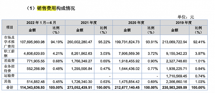 具体来看,报告期内用于市场及学术推广的费用合计7.81亿,占销售费用的比重均在90%以上,换算到收入的占比,分别为48.97%、53.91%、53.5%、57.29%,总体在50%左右。