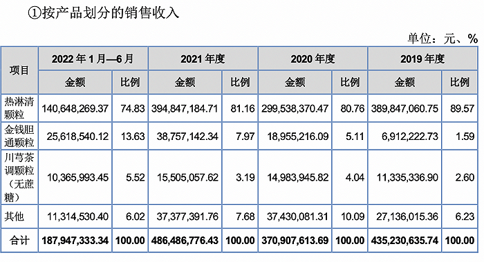 据介绍,威门药业的热淋清颗粒分为无蔗糖型和含糖型两类,其中报告期内90%左右的收入来源于无蔗糖型,销售金额分别为3.63亿元、2.69亿元、3.74亿元和1.28亿元。