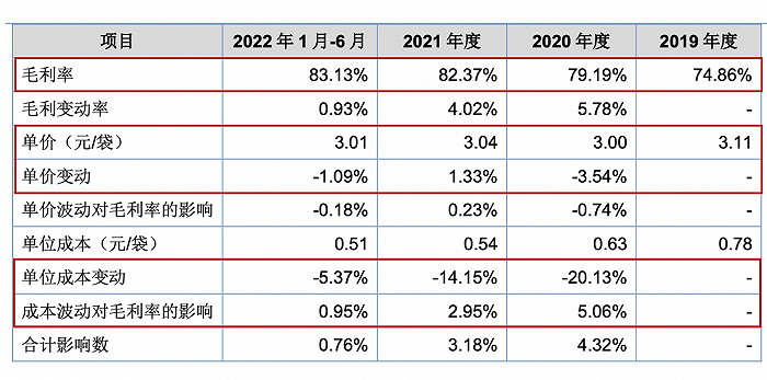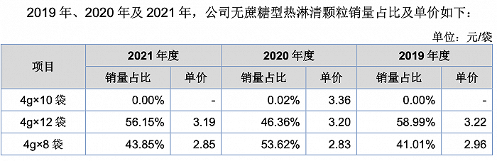 如图所示,报告期内热淋清颗粒(无蔗糖)一袋的单价有所波动,但总体维持在3元以上,而成本则在持续下滑,2021年降低至仅0.54元/袋,若以2019年-2021年三年为衡量口径,单价降幅在2.25%,成本降福在30.77%。