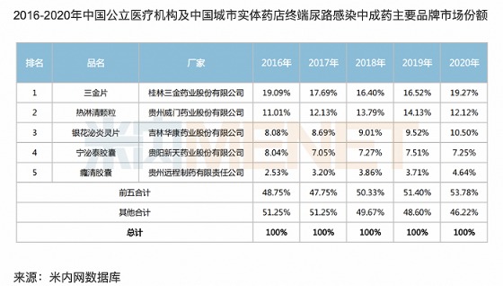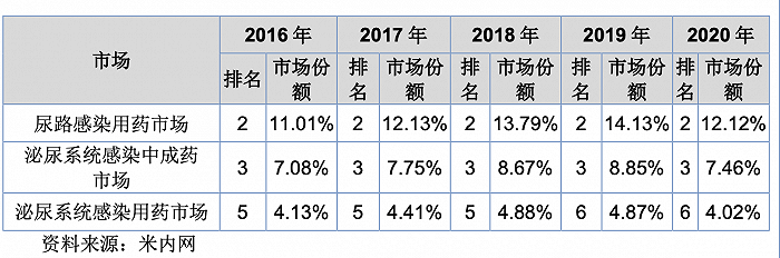 据介绍,热淋清颗粒系独家剂型,属于医保乙类目录用药,在泌尿系统中药市场建立了较强的竞争优势和品牌价值,销售额稳居前列。依据米内网数据,2016年-2020年连续五年在全国尿路感染用药市场、泌尿系统感染中成药市场份额中位居前三。