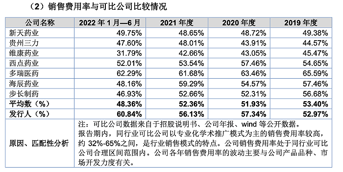而从行业横向来看,报告期内威门药业的的销售费用率基本高于行业的平均数,并且在可比公司的选择上公司并没有直接对标桂林三金。