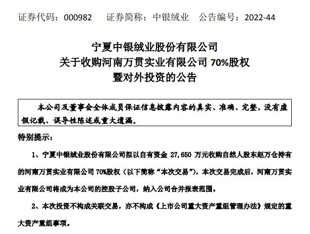 当晚,中银绒业发布公告称,拟以自有资金2.765亿元收购万贯实业70%股权,本次交易完成后,万贯实业将成为公司控股子公司,纳入公司合并报表范围。