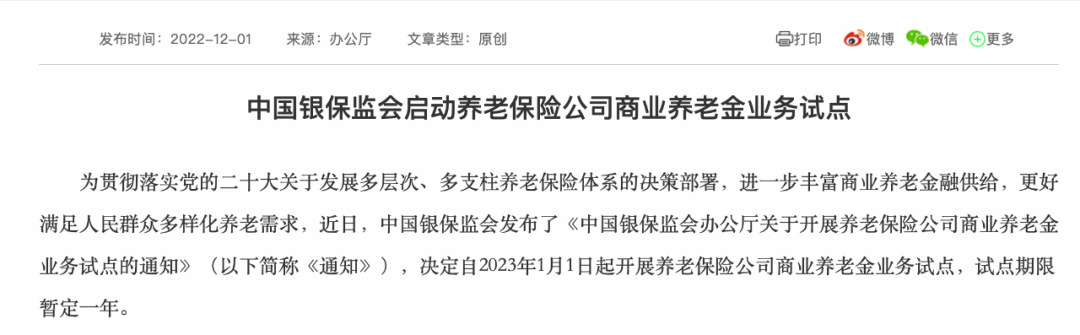 12月1日,银保监会发布《关于开展养老保险公司商业养老金业务试点的通知》(以下简称《通知》),决定自2023年1月1日起,在北京市、上海市等10个省(市)开展商业养老金业务试点。