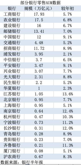 披露中期AUM规模的上市银行数据显示,截至6月末,26家上市银行零售AUM合计119.31万亿元,相比上年末增长7.8%。