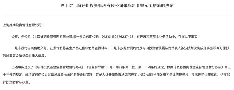 日前,上海好期投资管理有限公司(以下简称“好期投资”)因存在隐瞒或提供虚假信息等行为被上海证监局出具警示函。
