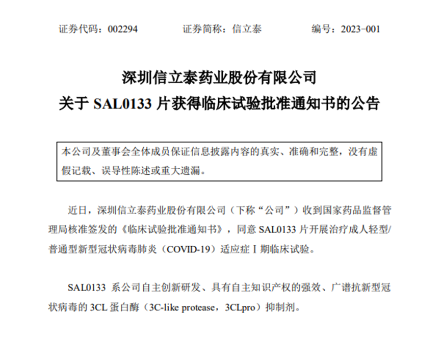 信立泰:新冠药SAL0133片获得临床试验批准
