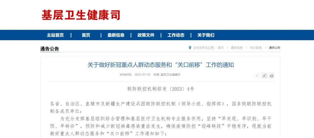 1月3日,联防联控机制印发《关于做好新冠重点人群动态服务和“关口前移”工作的通知》明确,坚持“早发现、早识别、早干预、早转诊”,预防和减少新冠病毒感染重症发生,确保疫情防控“迎峰转段”平稳有序。《通知》提出筑牢织密基层保健康防线、强化重点人群包保联系、主动做好重点人群动态服务、扩大吸氧和血氧监测服务、充分发挥中药治疗作用、加强医联体牵头医院对基层的支撑等12项具体要求。