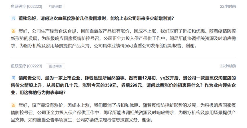 其中,对于近期受到关注的血氧仪价格问题,鱼跃医疗回答称,公司生产经营合法合规,目前血氧仪产品没有涨价,因成本上涨,公司取消了折扣和优惠。公司具体业绩情况可查看公司发布的定期报告。如有应当公告事项发生,公司亦会依法履行信息披露义务。
