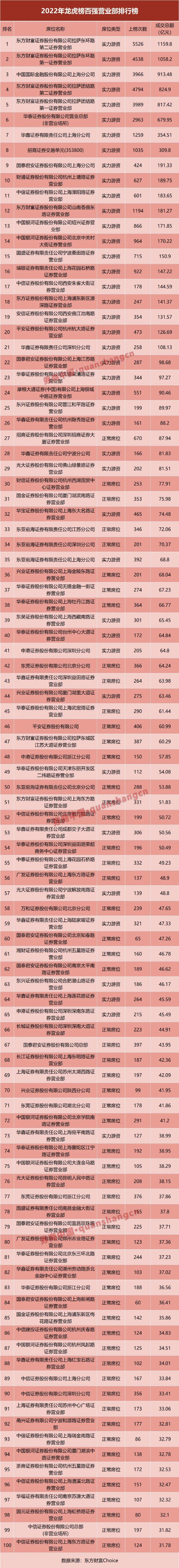 中金公司进入百强榜的家数则有所下降,2021年中金公司及旗下中金财富证券合计有5家营业部上榜,而2022年仅中金公司上海分公司这1个席位进入百强。