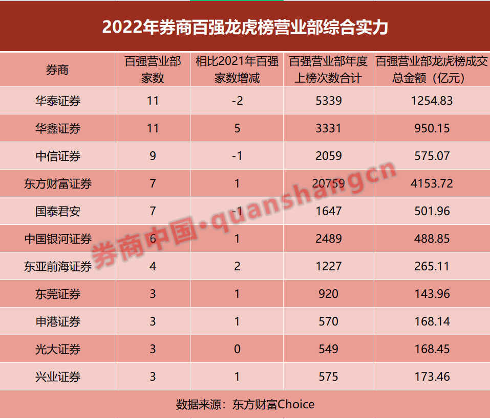 从券商龙虎榜营业部综合实力来看,华泰证券、华鑫证券、中信证券百强营业部家数排名居于前三,分别为11家、11家、9家。