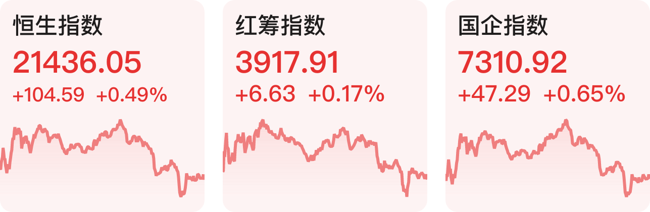 港股三大指数全线上涨。截至收盘,恒生指数涨0.49%,红筹指数涨0.17%,国企指数涨0.65%。恒生科技指数跌0.25%,内险股涨幅居前,中国太保涨近8%,新华保险、中国太平涨超4%,CXO概念、煤炭概念股走高,生物医药、锂电池板块尾盘涨幅小幅收窄,绿电板块多数收跌,节假日概念股领跌港股,周黑鸭跌近23%,颐海国际跌逾8%。