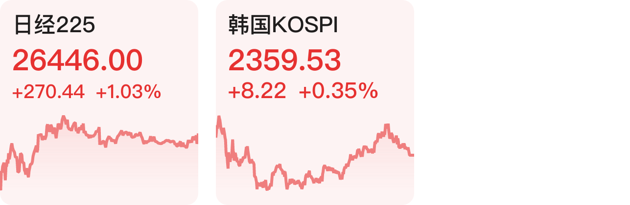 日经225指数涨1.03%,韩国KOSPI指数涨0.35%。