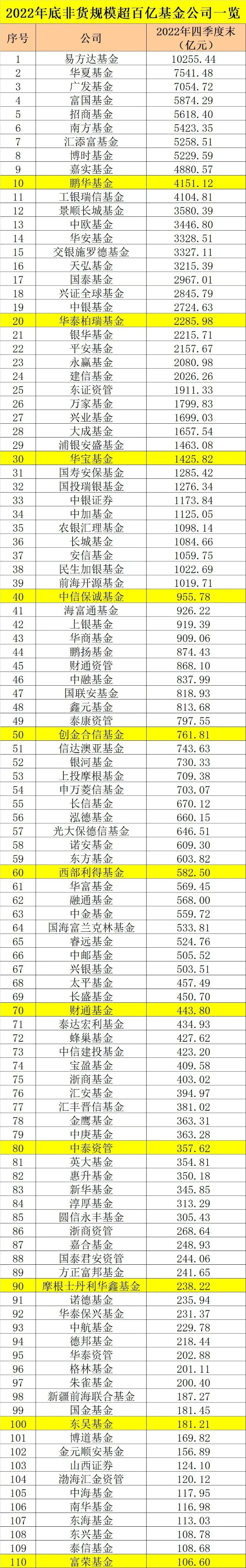 从天相投顾统计的基金公司规模来看,截至2022年底,易方达基金非货规模(含估算)高达1.0255万亿元,仍然是目前唯一一家非货规模超万亿的基金公司。