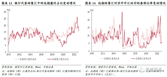 远期购汇履约和对冲比率上升。2022年,远期结汇履约占比和购汇履约占比均值分别为18.8%、19.2%,较上年上升0.9、5.1个百分点;远期结汇对冲比率和购汇对冲比率均值分别为12.4%、13.4%,前者较上年微降0.4个百分点,后者则上升2.9个百分点。尤其是9月份,随着人民币汇率再次跌破7,远期购汇履约占比和对冲比率分别升至26.4%、22.7%,前者创历史新高,后者为2015年9月以来新高,有助于减缓人民币贬值带来的影响。之所以10月至12月远期购汇履约占比和对冲比率骤降,一定程度上反映了外汇风险准备金政策影响,即央行自9月末开始对远期售汇业务征收外汇风险准备金,会增加企业使用远期和期权对冲汇率风险的成本,进而减少远期购汇需求(见图表13、14)。
