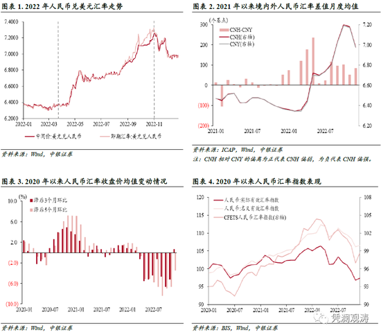 在岸人民币兑美元贬值是由离岸市场驱动。与在岸人民币(CNY)不同,离岸人民币(CNH)按照离岸市场对国际货币的监管方式运作,因此离岸人民币汇率调整更加及时充分,对在岸人民币汇率产生影响。2022年各月,CNH持续弱于CNY,境内外汇差年度均值由上年+2.5个基点扩大至+92个基点。尤其是3月至5月(即年内人民币第一波贬值期间),境内外汇差均值分别为+120个基点、+177个基点和+234个基点,明显高于其他月份。11月和12月,CNH仍然弱于CNY,不过CNY转为升值,显示年末人民币升值转为由在岸市场驱动(见图表2)。