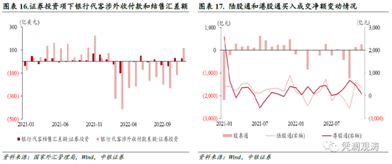从全年数据来看,2022年人民币兑美元中间价累计贬值8.5%,证券投资项下跨境资金确实转为净流出:银行代客涉外收付款、结售汇累计逆差分别为1918亿、65亿美元,二者均为2018年以来首次逆差,前者更是创下历史新高;陆股通与港股通净买入成交额轧差后,股票通项下资金由上年净买入531亿元转为净卖出2459亿元,仅次于2020年的3877亿元;债券通项下境外机构累计净减持人民币债券6161亿元,为债券通启动以来首次年度净减持,12月份债券通恢复净买入580亿元,结束了2至11月份连续10个月的净卖出(见图表16至18)。