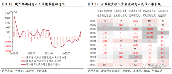 不过,人民币贬值不等于有贬值预期。从3月初到11月初8个月时间,就调整了10%以上,这及时释放了市场压力、避免了预期积累。同时,当人民币贬值到一定程度后,人民币计价资产估值降低,对外资吸引力增强,或促使资金回流。2022年的月度数据进一步印证了,人民币汇率涨跌并非资本流动的核心影响因素。2022年2月,人民币仍处于升值状态,而证券投资项下涉外收付和结售汇率先转为逆差,境外机构大幅减持人民币债券;3月至10月,人民币持续贬值期间,证券投资项下结售汇差额和股票通净买入成交额时正时负,其中4月人民币贬值幅度达到全年最大,但证券投资项下涉外收付和结售汇逆差、境外机构减持人民币债券的最大规模则出现在3月;11月,人民币转为升值,但证券投资项下涉外收付款仍为逆差,境外机构仍在减持人民币债券,直到12月才转为净流入状态(见图表19)。