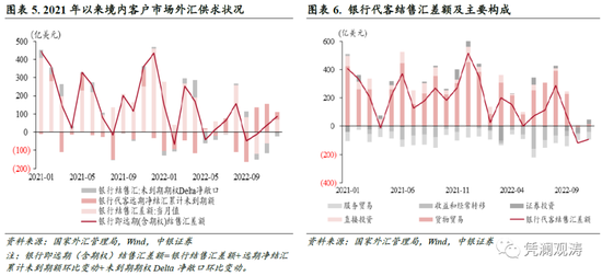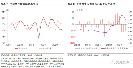 汇率杠杆调节作用正常发挥。2022年3月至10月(即人民币贬值期间),剔除远期履约额之后的银行代客结汇额占涉外外汇收入比重(收汇结汇率)均值为55.0%,大于2020年6月至2022年2月(即人民币升值期间)均值53.9%;剔除远期履约额之后的银行代客购汇额占涉外外汇支出比重(付汇购汇率)均值为53.8%,小于2020年6月至2022年2月均值55.9%;收汇结汇率均值与付汇购汇率差额由-1.9个百分点转为+1.2个百分点(见图表7、8)。