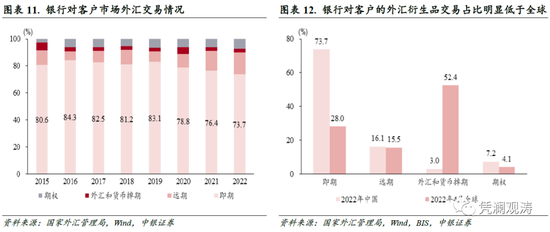 外汇衍生品交易占比明显上升。2022年,银行对客户的外汇交易中,即期交易占比继续回落,从上年76.4%降至73.7%,为历史新低;远期和期权交易占比分别从14.9%、6.2%升至16.1%、7.2%,外汇和货币掉期交易占比最小,但也有所上升,从上年2.5%升至3.0%,外汇衍生品交易合计占比26.3%,为历史新高。不过,国际清算银行(BIS)发布的全球外汇市场调查数据显示,2022年4月全球外汇衍生品交易占比为72%,远大于中国外汇衍生品交易占比,表明国内市场主体运用外汇衍生品防范汇率波动风险和加强资金管理方面仍有较大改进空间(见图表11、12)。