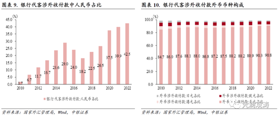 人民币涉外收付占比创新高。2022年,银行代客涉外收付中的人民币占比延续2018年以来升势,较上年上升2.6个百分点至42.5%,创历史新高。对于境内市场主体而言,在跨境收付中使用人民币,有助于避免汇率波动风险,降低货币错配风险。不过,在外币币种构成中,境内主体对美元依赖度仍然较强,美元占比延续2016年以来升势,较上年上升0.5个百分点至90.8%,同样为历史新高(见图表9、10)。其中,3至12月份,非银行部门涉外外币收付中美元占比为90.7%,较前2个月占比回落0.7个百分点,但较上年同期上升0.3个百分点。这意味着人民币兑美元双边汇率变化对境内涉外企业财务状况影响进一步加深。同时,也表明境内主体涉外外币收付降低对单一币种的过度依赖依然任重道远。
