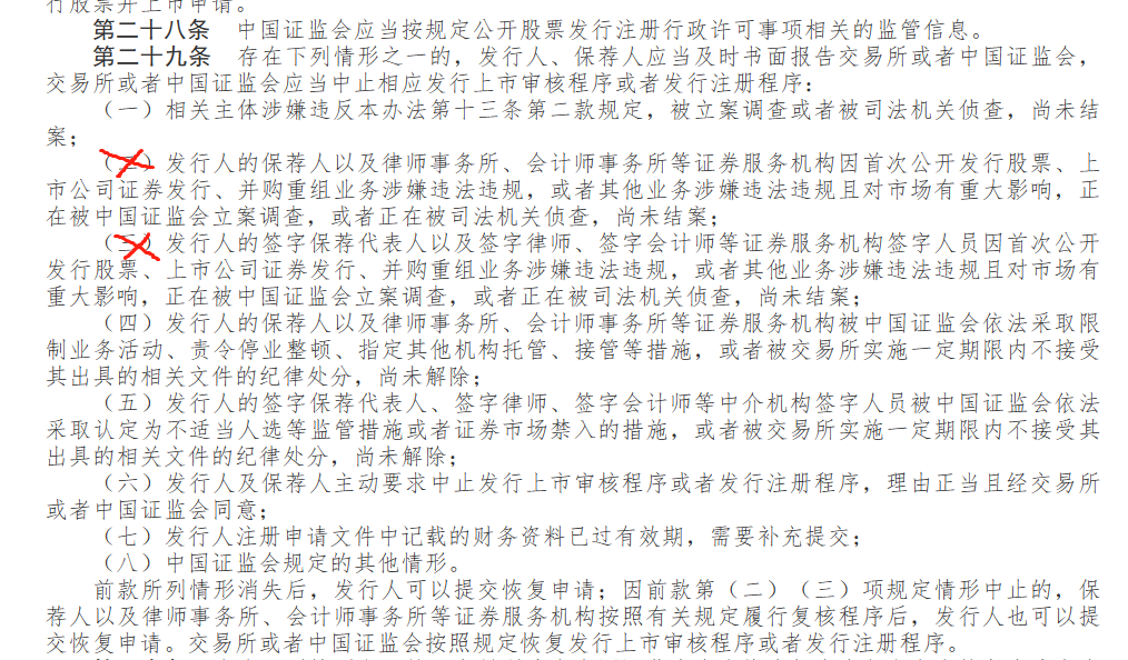 “尤其值得注意的是,尽管第二条情形紧跟着第一条情形删除了,但是我认为不会有实质性的影响,机构不会被大面积连坐牵连,但是如果保代或签字会计师、律师被立案调查了,个人的项目肯定还是有影响的。”华南上述中小券商高管表示。