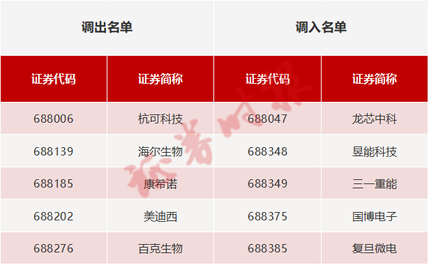 其中,科创50更换5只样本,龙芯中科、昱能科技、三一重能、国博电子和复旦微电5只股票将被调入科创50指数。