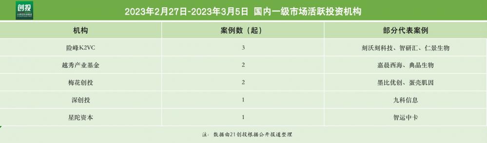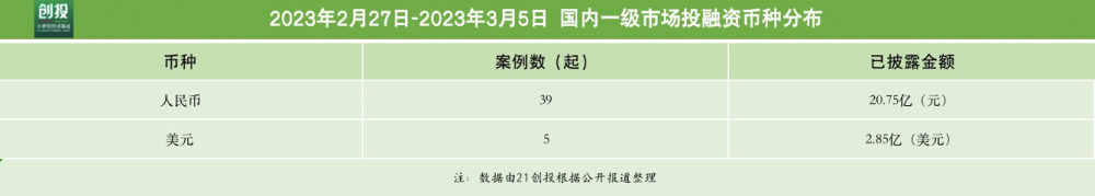 21创投不完全统计,2月27日——3月5日,报告日期内国内一级市场发生融资事件39起,总规模超20.75亿元。