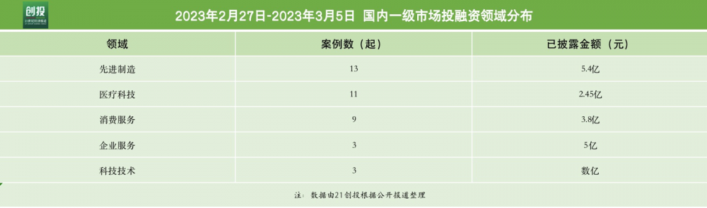 从融资案例数量来看,先进制造、医疗科技和消费服务融资最为活跃,分别为13起、11起、9起。