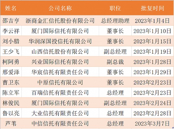 除了董事长、总经理职位的变更,山西信托、兴业信托、厦门信托都有新副总到任,浙商金汇信托迎来新任总经理助理。