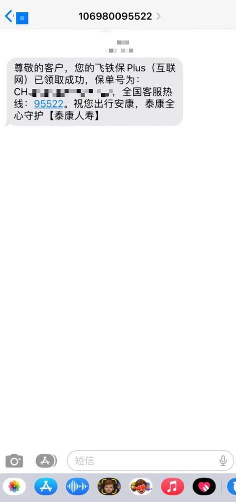 “尊敬的客户,您的飞铁保Plus(互联网)已领取成功,保单号为:……”