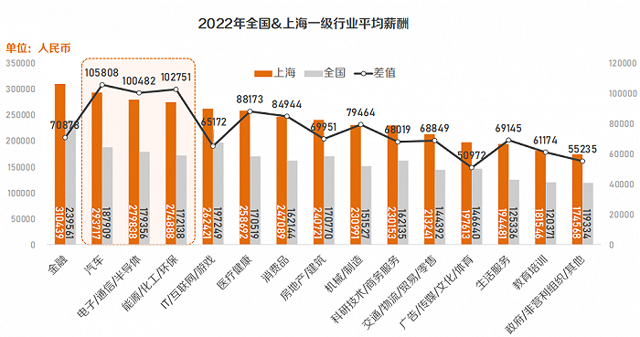 聚焦中高端人才薪酬,2022年上海地区中高端人才平均薪酬为25万元,远超全国中高端人才平均薪酬15.34万元,大城市薪资吸引力由此显现。分行业来看,金融及汽车行业在上海及全国范围薪酬都具有较大吸引力,薪酬排名都位列前三,上海金融行业人才均薪更是突破30W;其中上海对比全国薪酬差值较大的行业,如:汽车、电子通信、能源化工等薪酬差值都超过10W元,这些行业在跨区域人才吸引上具备较大的优势。