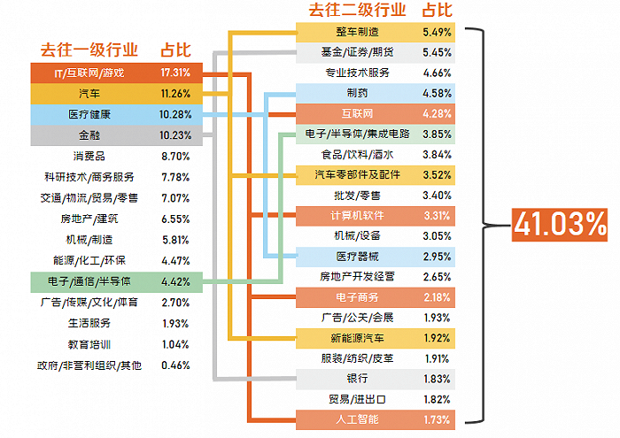 近期,人才跨区域流动现象受到关注,杭州从北京上海吸引人才成为热门话题。猎聘大数据分析认为,从上海方面来看,半导体、生物医药、人工智能、新能源汽车等行业的快速发展,带来较大的人才缺口,同时薪酬及薪资涨幅皆领跑全国,跨区域流入上海地区的人才中,去向前20的二级行业中,有将近4成人才会选择这些行业进行就业。此外,金融行业作为上海乃至全国薪酬排名第一的高薪行业,也吸引了10.23%的人才流入,而其二级行业基金证券期货,也位列上海引才细分行业第二名,占比为5.45%。