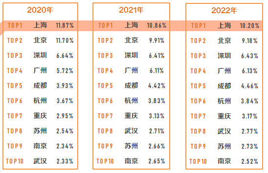 猎聘大数据研究院发布的《上海地区人才供需数据报告》显示,在人才储备方面,近三年上海地区人才保有量全国占比第一。即使受到疫情影响,上海仍成为人才保留最多的一线城市。数据显示,2022年,上海人才保有量占比为10.2%,高于第二名北京(9.18%),以及深圳(6.43%),在榜单中一线大城市人才保有量占比稳居前三甲。
