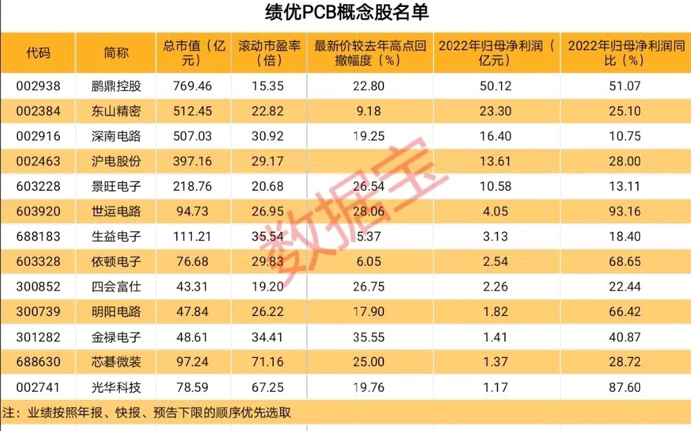 证券时报·数据宝统计,PCB概念股有40只,包含12只市值超百亿元的股票,鹏鼎控股总市值规模最大,最新市值达769.46亿元。概念股中,近20股滚动市盈率不足30倍,包含沪电股份、生益科技、景旺电子、鹏鼎控股等。