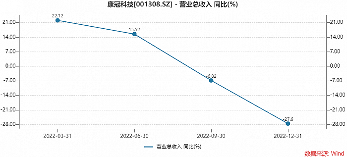拆成单季来看,康冠科技下滑趋势更为明显。2022年第四季度,公司实现营业收入25.05亿元,为去年最低值,同比下滑27.60%。此前一二季度营收正增长,而第三季度的同比下滑幅度在6.82%。