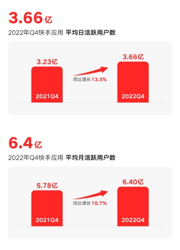 数据显示,2022年第四季度,快手应用的用户规模突破历史新高,平均DAU同比增长13.3%达3.66亿,平均MAU同比增长10.7%达6.4亿。随着平台社交互动与信任氛围的继续加强,互相关注的用户对数达267亿对,同比增长63.4%。此外,Q4短视频日均互动(包括点赞、评论和转发等)总量同比增长超50%。