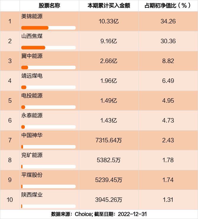 本期基金累计买入金额最高的前十大个股分别是美锦能源,山西焦煤,冀中能源,靖远煤电,电投能源,永泰能源,中国神华,兖矿能源,平煤股份,陕西煤业。