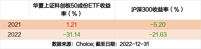 2022年度,截止至12月31日,华夏上证科创板50成份ETF基金收益-31.14%,同期沪深300收益-21.63%,同类排名1368/1485。