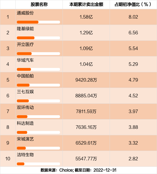 本期基金累计卖出金额最高的前十大个股分别是通威股份,隆基绿能,开立医疗,华域汽车,中国船舶,三七互娱,双环传动,科达制造,宋城演艺,洁特生物。