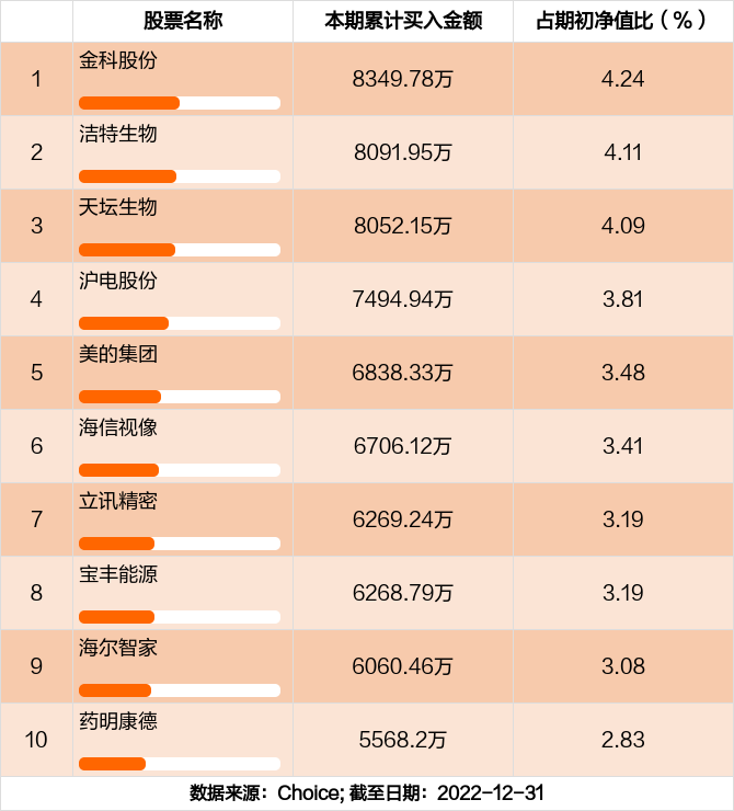 本期基金累计买入金额最高的前十大个股分别是金科股份,洁特生物,天坛生物,沪电股份,美的集团,海信视像,立讯精密,宝丰能源,海尔智家,药明康德。