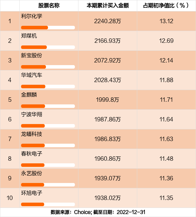 本期基金累计买入金额最高的前十大个股分别是利尔化学,郑煤机,新宝股份,华域汽车,金麒麟,宁波华翔,龙蟠科技,春秋电子,永艺股份,环旭电子。