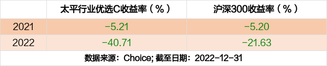 2022年度,截止至12月31日,太平行业优选C基金收益-40.71%,同期沪深300收益-21.63%,同类排名723/725。