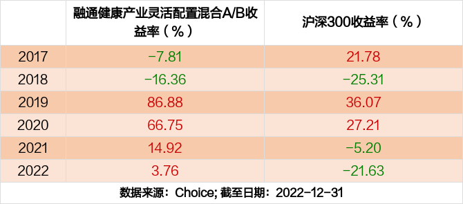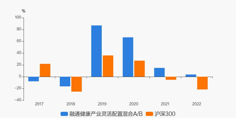 2022年度,截止至12月31日,融通健康产业灵活配置混合A/B基金收益3.76%,同期沪深300收益-21.63%,同类排名35/2180。